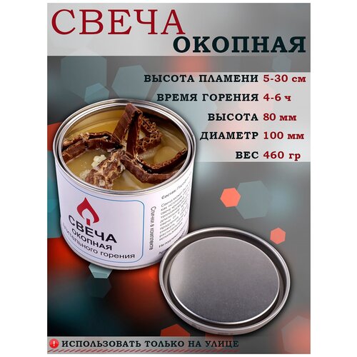 Свеча окопная армейская предназначена для освещения и обогрева укрытий, для быстрого разогрева и приготовления пищи, сушки одежды в полевых условиях. Свеча в банке горит 4-6 часов, выделяя большое количество тепла. Высота пламени – 5-30 см. Использовать только на улице! Окопная свеча не боится влаги и горит даже при сильном ветре. Состав: 100% парафин. Предварительно разогретую, погашенную и накрытую крышкой свечу с расплавленным парафином можно использовать как грелку, аккумулирующую тепло.